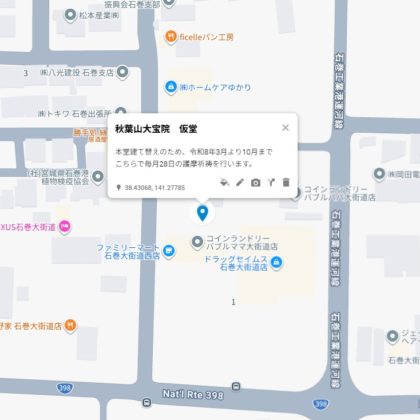 大宝院は東日本大震災の後、宮城県石巻市に新しく生まれた真言宗のお寺です。本尊は不動明王、また火防の神である秋葉権現をお奉りする神仏習合のお寺です。皆さまの悩みや祈りにお応えする親しみやすいお寺を心がけております。どうぞお気軽にご相談ください。